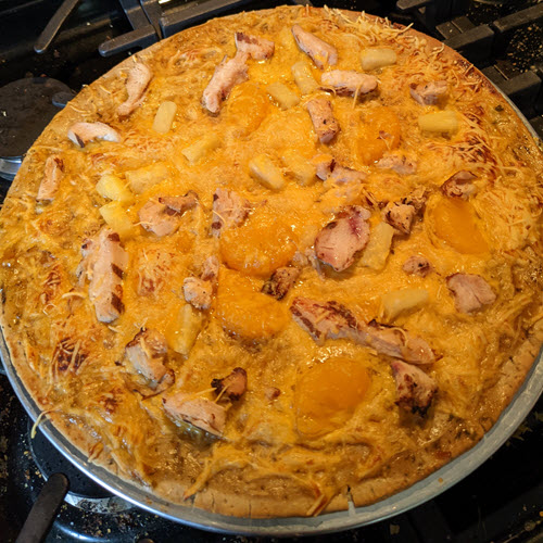 1. Cover the premade crust with a thin layer of the orange ginger sauce.