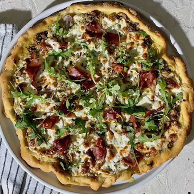 Sprinkle arugula on top of pizza, followed by crushed red pepper, and a drizzle of the remaining 1 tablespoon olive oil; cut into slices and serve.